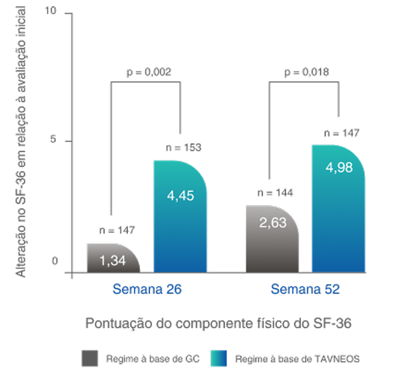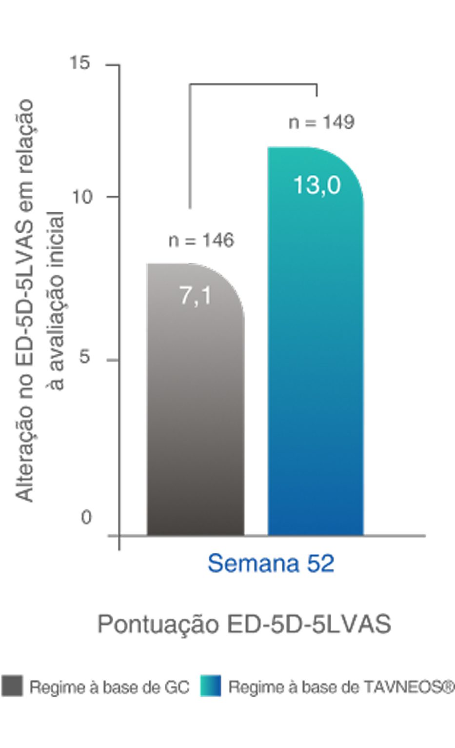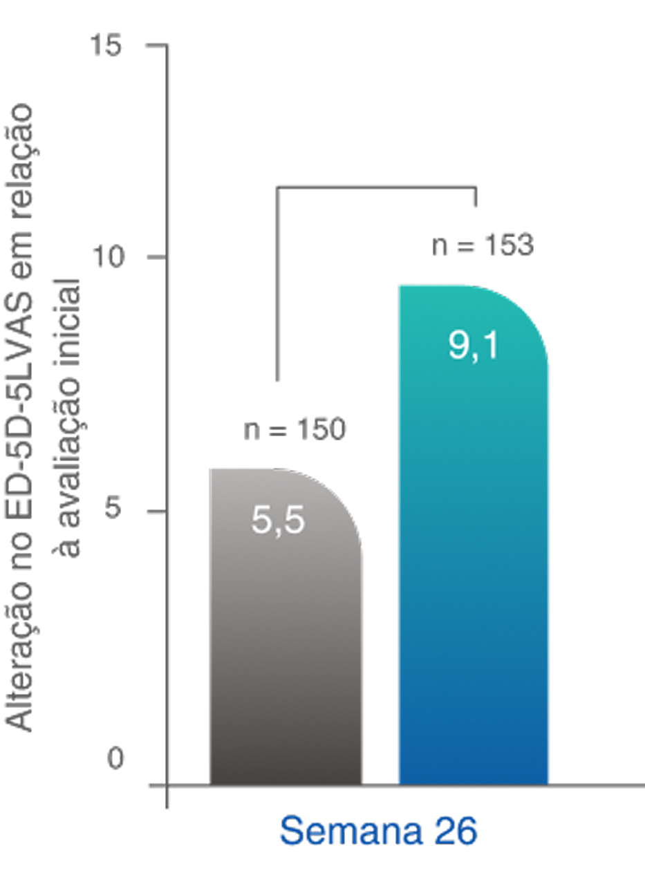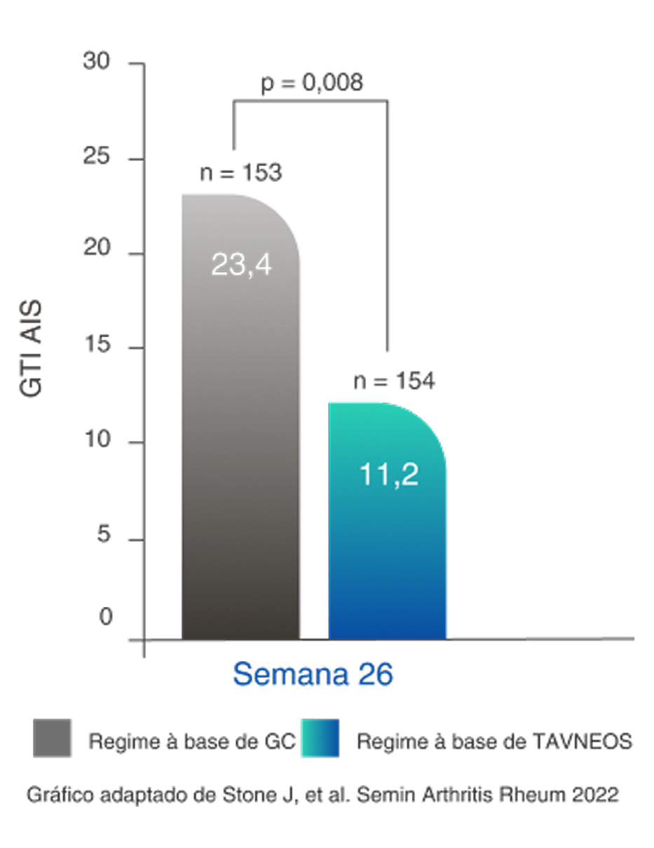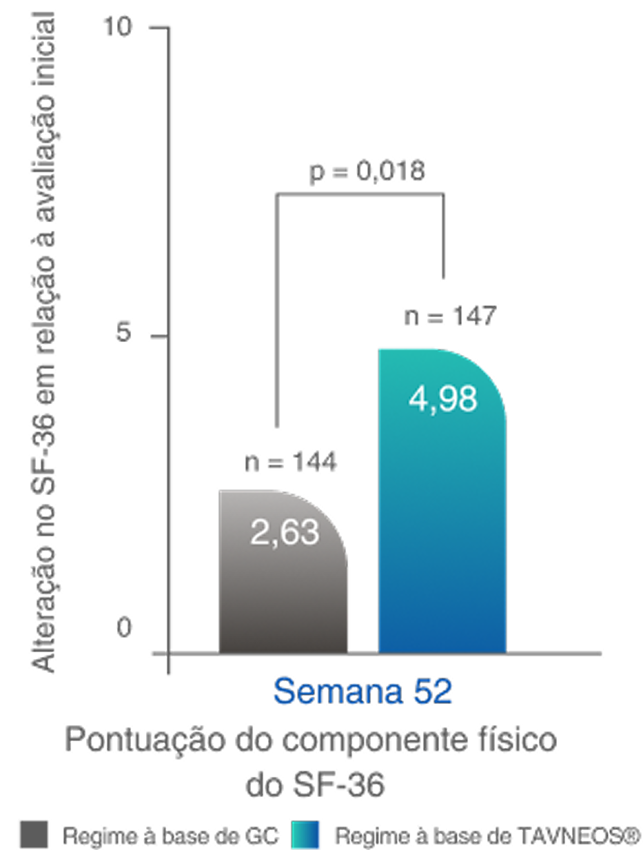 ‡Com o índice EQ-5D-5L, foram observadas melhoras numéricas na semana 26 e melhoras significativas na semana 52 (p=0,009) no regime baseado em TAVNEOS versus regime baseado em GC.6
