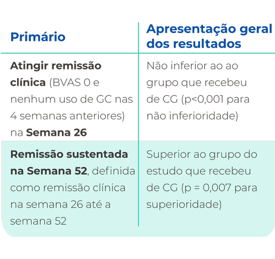 O regime baseado em TAVNEOS demonstrou não inferioridade na remissão clínica na semana 26 e superioridade na remissão clínica sustentada na semana 52 versus um regime baseado em GC2*