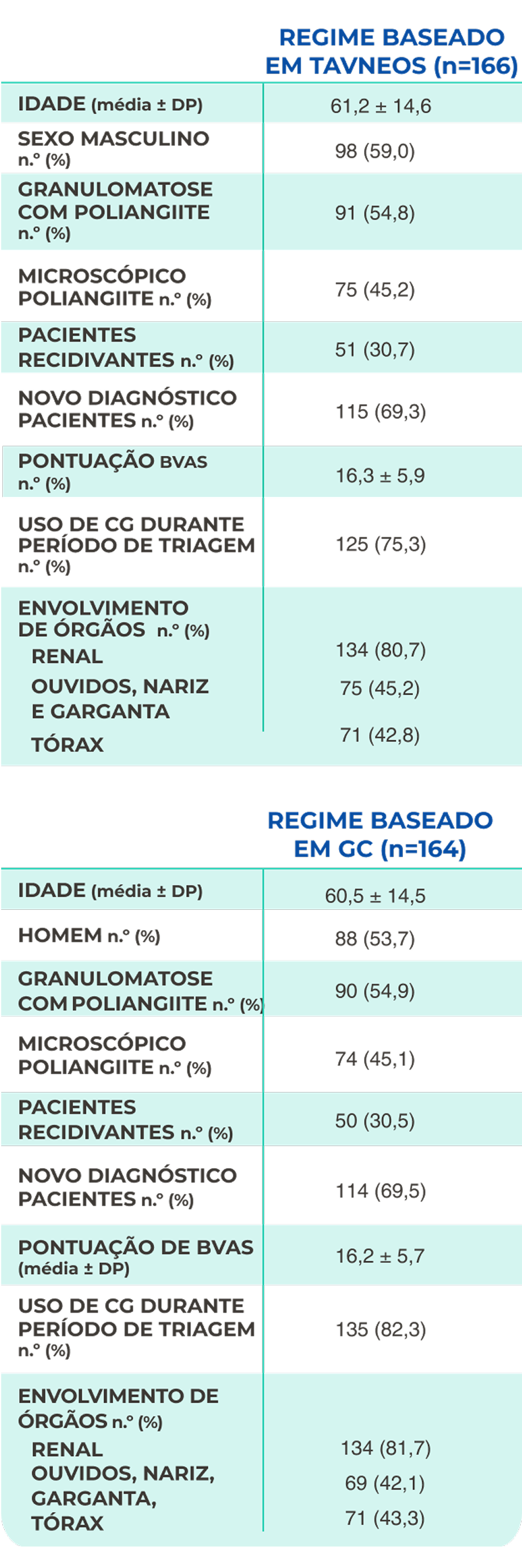 Estudo pivotal fase 3, multicêntrico, internacional, comparador ativo, randomizado, duplo-cego, duplo-pareado, controlado, de 52 semanas, com pacientes randomizados para receber TAVNEOS 30 mg duas vezes ao dia (N=166) ou esquema de redução gradual de prednisona por 20 semanas (60 mg por dia reduzidos até a descontinuação na semana 21) (N=164) em adição à ciclofosfamida (seguido de azatioprina) ou ao rituximabe.2