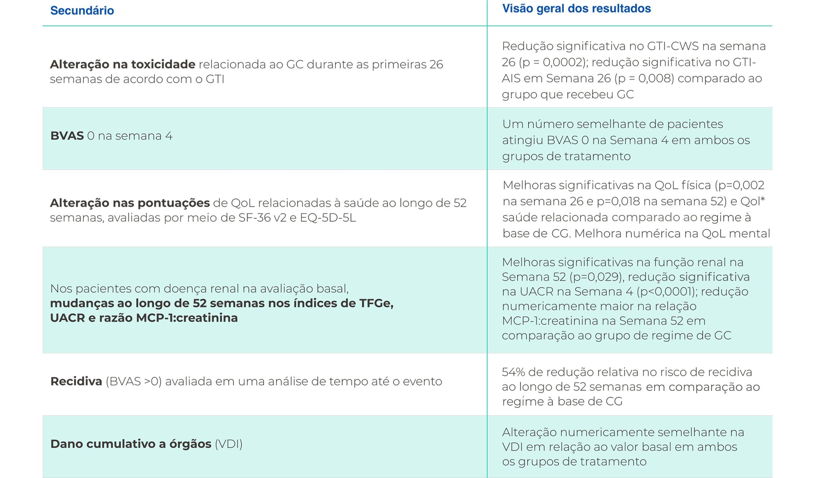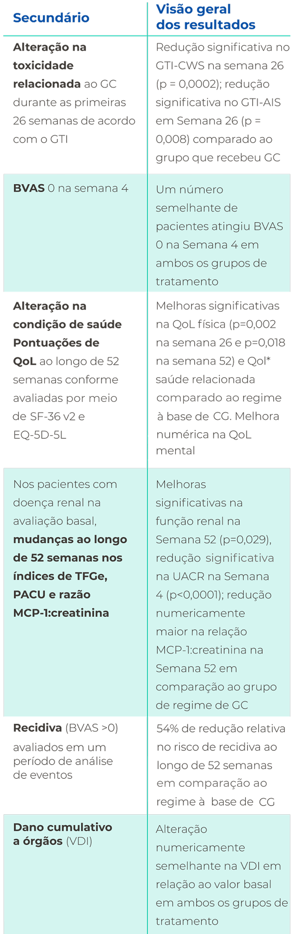 VAA, Vasculite associada ao ANCA; PMA, Pontuação de melhora agregada; ANCA, anticorpo anti-citoplasma de neutrófilos; PAVB, Pontuação da atividade da vasculite de Birmingham; CD19, grupo de diferenciação 19; IC, intervalo de confiança; DRC, doença renal crônica; PAC, Pontuação de agravamento cumulativa; CYC, ciclofosfamida; TFGe, taxa de filtração glomerular estimada; EQ-5D-5L, EuroQol 5 dimensões 5 níveis; GC, glicocorticoide; GPA, granulomatose com poliangeíte; GTI, Índice de toxicidade de glicocorticoides; IV, intravenoso; MCP-1, proteína quimiotática de monócitos-1; MOA, mecanismo de ação; PAM, poliangeíte microscópica; MPO, mieloperoxidase; NNT, número-necessário-para-tratar; PR-3 proteinase-3; QoL, qualidade de vida; RTX rituximabe; DP, desvio padrão; SF-36, Pesquisa de Saúde de Formulário Curto de 36 Itens ; UACR, razão albumina:creatinina urinária; EVA, escala visual analógica.
