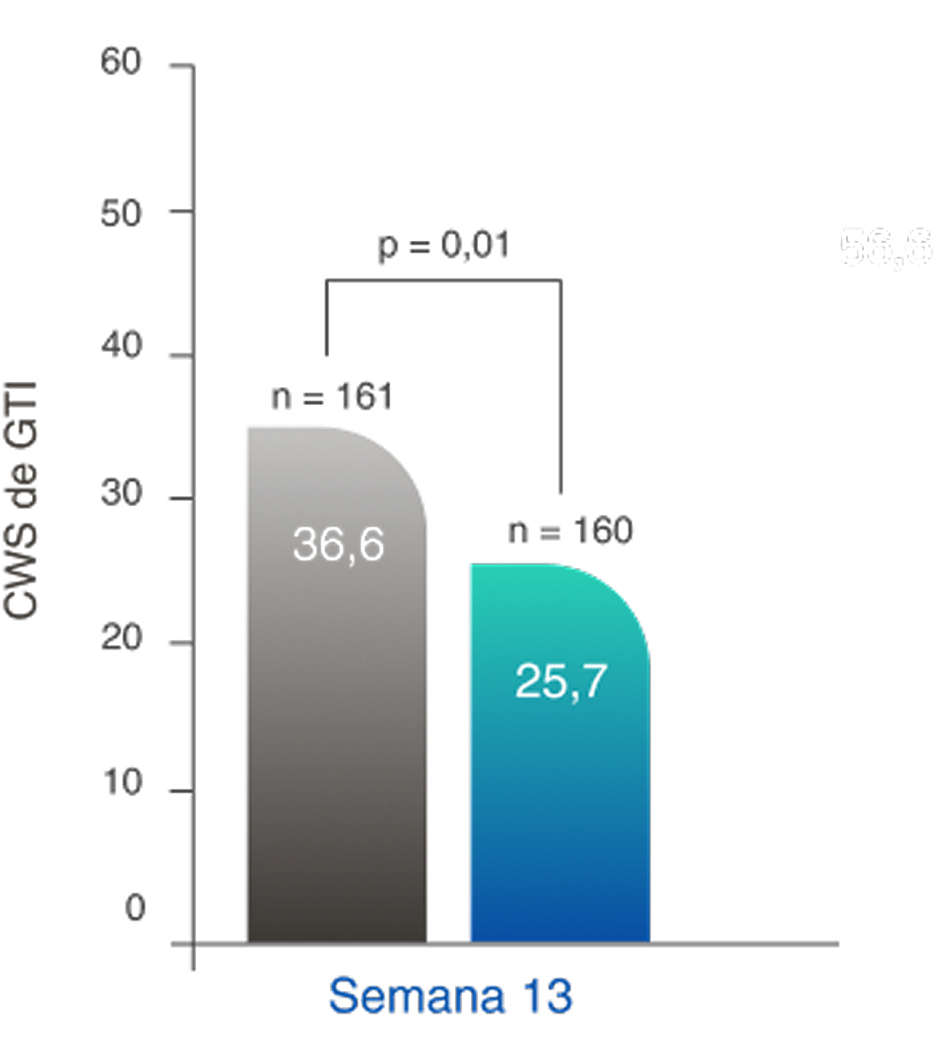 Diferença na semana 13: -11,0 (IC de 95%, -19,7 a -2,2)
