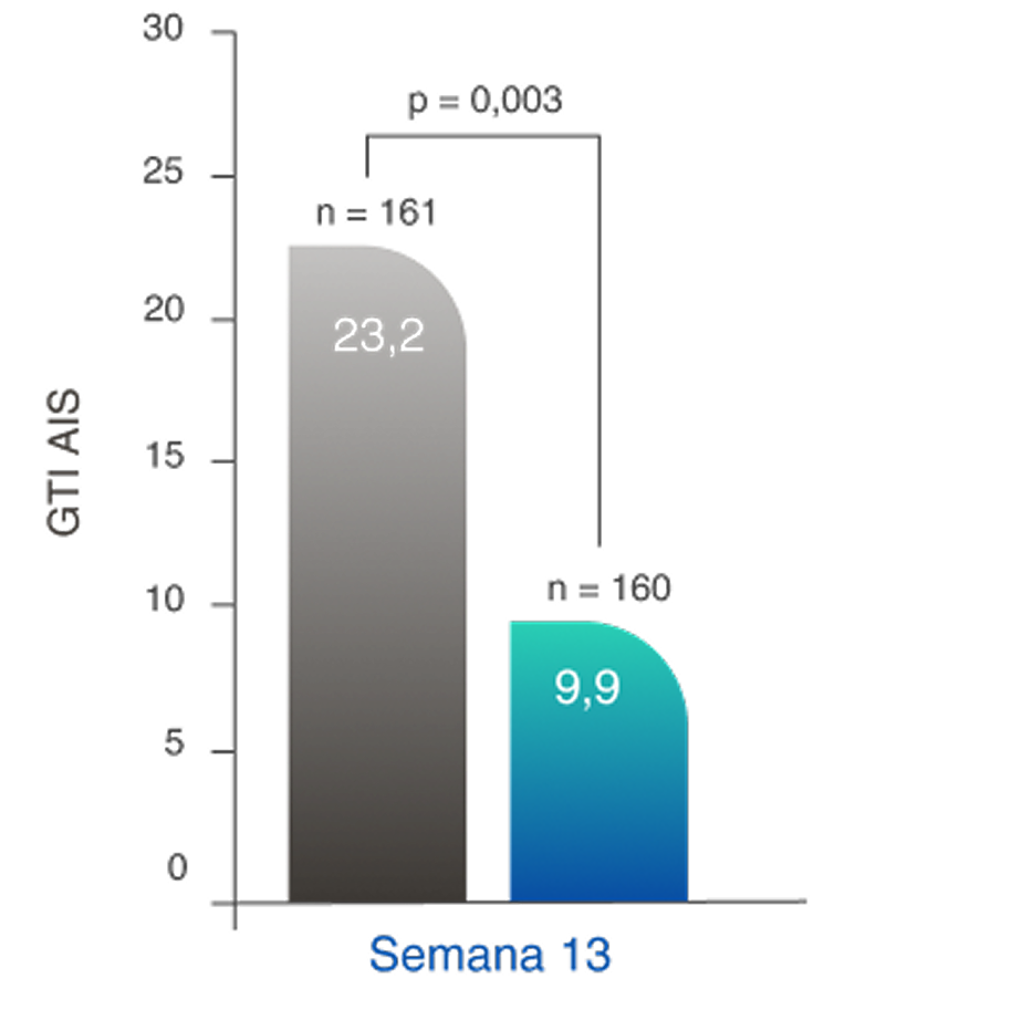 Diferença na semana 13: -13,3 (IC de 95%, -22,2 a -4,4)