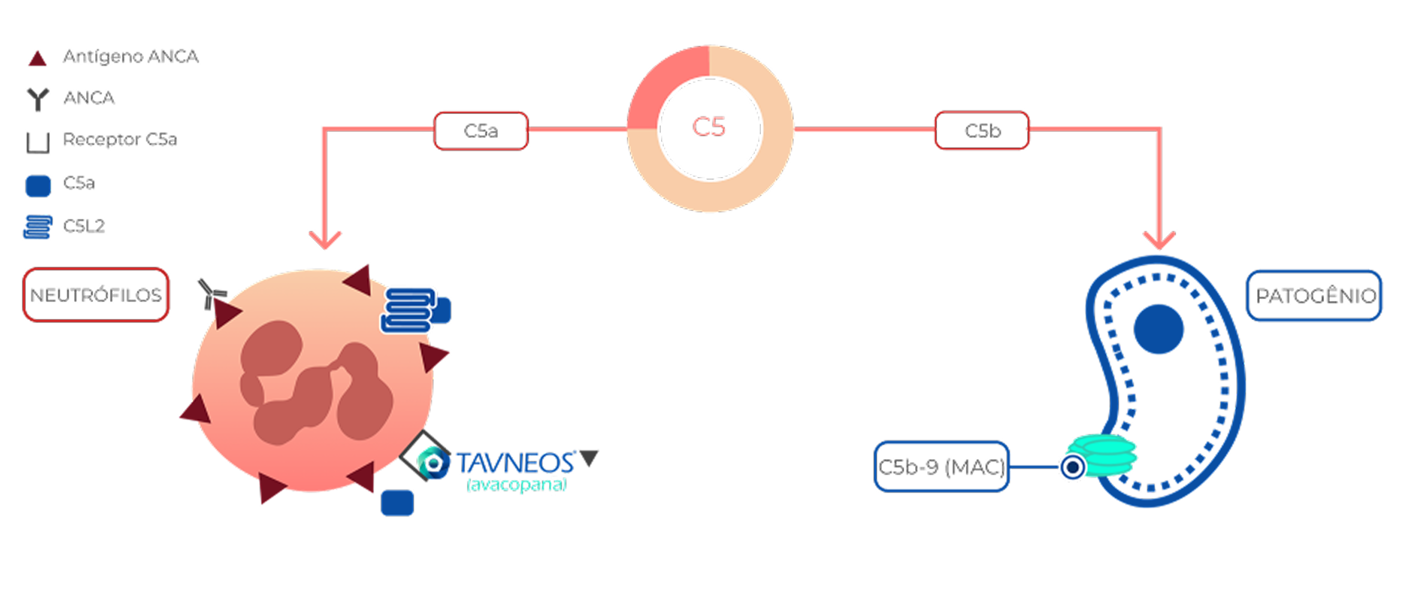 VAA, vasculite associada ao ANCA; ANCA, anticorpo anticitoplasma de neutrófilos; C5a, componente 5a do sistema complemento; C5b, componente 5b do sistema complemento; C5L2, C5a semelhante ao receptor 2; CYC, ciclofosfamida; EULAR, Aliança Europeia de Associações de Reumatologia; GC, glicocorticoide; TFG, taxa de filtração glomerular; GPA, granulomatose com poliangeíte; KDIGO, Kidney Disease: Improving Global Outcomes; MAC, complexo de ataque à membrana; MOA, mecanismo de ação; PAM, poliangeíte microscópica; RTX, rituximabe.