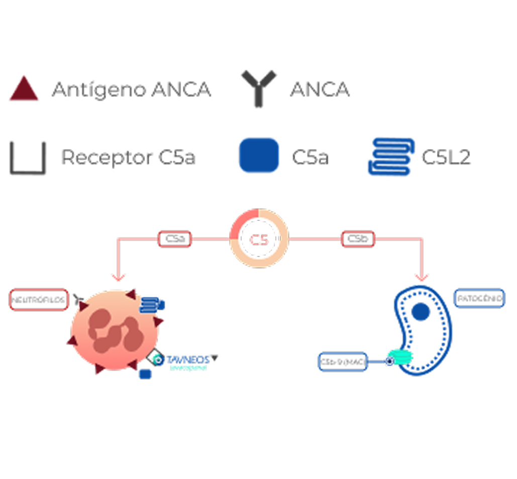 A ativação da via alternativa do complemento desempenha um papel fundamental na VAA, e nenhuma terapia estabelecida aborda isso como um fator chave da inflamação vascular2,5-10